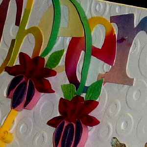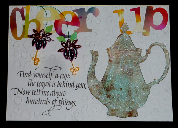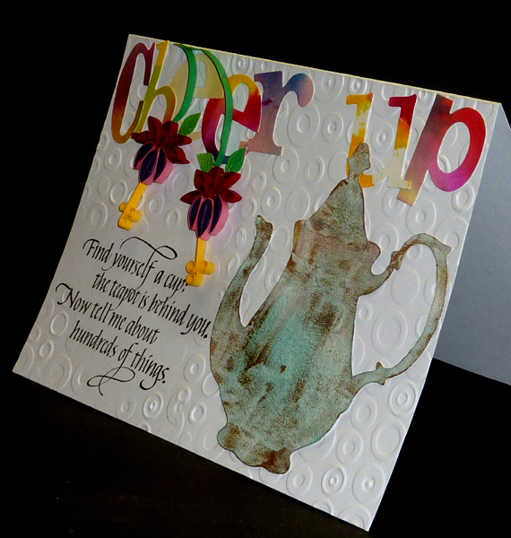 Created: July 29, 2012 I think the bright lettering and fuchsias can really cheer a friend up when they're down... At my last quilling session a friend gave each of us a Cottage Cutz "Tall Teapot" die cut and challenges us to use it... I'm using a fabulous quote stamp from Quietfire Design |