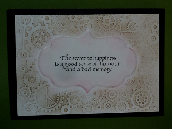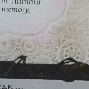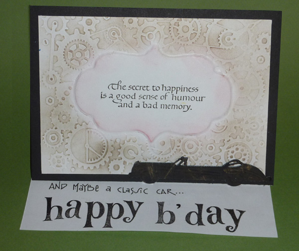 I created a template using the Sizzix Tim's Mover's & Shapers die "Styled Labels" and some mat board, placed it on my die where I didn't want my embossing folder (Cuttlebug "Clockworks") to emboss. Ran through my machine with a piece of 110# white cardstock. Then used the drop out piece from my template and a very large balled stylus and ran it around the drop out to really emboss the area. Sponged some Distress Pumice Stone on the embossed area and some Worn Lipstick on the embossed label area. Kept the dropout under my cardstock and stamped the quote with Versafine Black Onyx. Trimmed it down and adhered it to black cardstock keeping the borders even all around. Scored and folded my easel card and adhered my embossed piece onto the front. Die cut my car (Marianne Designs LR0198) from a glossy black paper that had some gold paint on it and then ran it through again embossing the design. Also cut 2 more die cuts from black cardstock and layered all three pieces so it would be nice and strong. Added some tabs to the wheel hubs and then onto the floor of my card to act as a stopper. Stamped the words Happy B'Day (Hero Arts "Happy Letters" alphabet set) with the black and clear embossed. Wrote in my words with a Zig Writer. |
