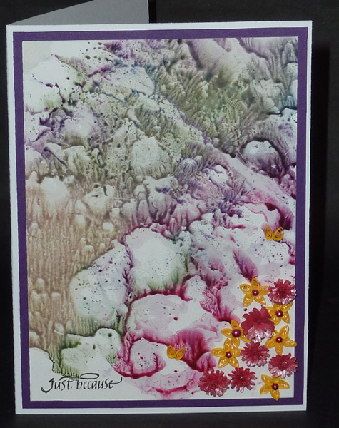 I had done the dribbling technique with the waxed crayons - no yellow or orange or other light colors... Lined them up on my glossy paper and melted away with my Stampin Up heat gun. It sputtered and melted ok, but I wasn't that happy with the result. And I already had some nice pieces done during this play day, so just turned the glossy paper over onto my craft sheet, took the hot iron and ran it over the back so the wax would transfer to my craft sheet. I then took a clean glossy paper placed it on my craft sheet, ran the hot iron over it and voila - glorious. This was truly a serendipitous moment. Die cut the strips for the fringed flowers using a deep rose toned pearlized paper. Made very small quilled yellow petals adhered them together to make a 5 petal flower and added a purple half pearl to each. Stamped the sentiment with Versafine Black Onyx |