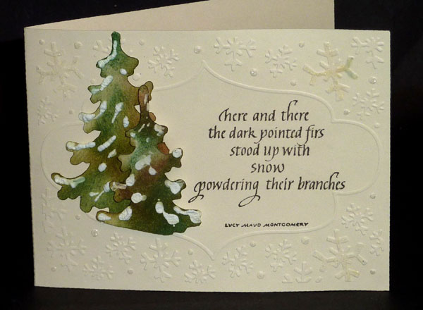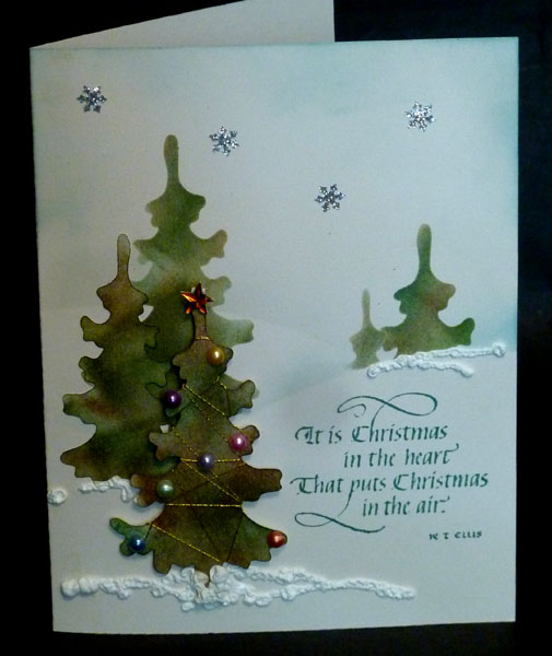 Created: July 27, 2012 My friend brought over a Marianne Design "Pine Tree" which I thought was a really pretty die, so cut a few... I'm using Xmas quote stamps for both cards from Quietfire Design |