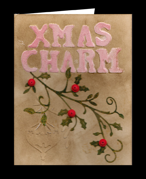 I used Tim's Sizzix word die "Dream" as a template to create my letters to spell "Xmas Charm". The "h" is the letter "E" flipped with top and bottom removed. The "C" is part of the letter "D". The "X is the only one I had to create from scratch... Anyway once I created the words, I scanned it and cut with my electronic cutter (but can be cut by hand) using 110# white cardstock. I stacked and adhered two cut outs together to use as my stencil. Using a light table (a window will work) started the embossing with a large balled stylus onto 67# white cardstock and then defined the letters with a smaller stylus. I also used a bit of waxed paper to make my stylus glide better. When done, hit the high points of the letters with a sponge and Distress "Worn Lipstick" and embossed with Pearlescent embossing powder. Then sponged Gathered Twigs all over, putting more color in the letter area. Adhered it to my side folded card and trimmed the edges. |