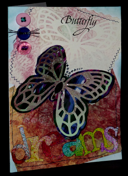 As I mentioned above, I cut out the background I was working on and sewed it to my card front along with the transfer paper itself. Sewed around the edges with a dark blue thread. Sponged Distress Broken China around the edges. Tied some ribbon or thread through the buttons and adhered them to the card. Die cut the large butterfly (Spellbinders) from a minty green cardstock, and you can see some of the transferred paint on the wings. Used the outline of the die to cut the silk, then adhered the two together. Applied some Stickles to parts of the butterfly then sprinkled Ritz micro fine glitter "Stardust" then adhered it to the card at the body only. Added rhinestone antennae and body. I used Tim's Sizzix "Word Play" alphabet die and cut my letters, sprayed them with Dylusions Ink sprays, dried them and outlined the edges with a Distress Purple marker, then adhered them to card. Stamped the butterfly word with Versafine Black Onyx. |