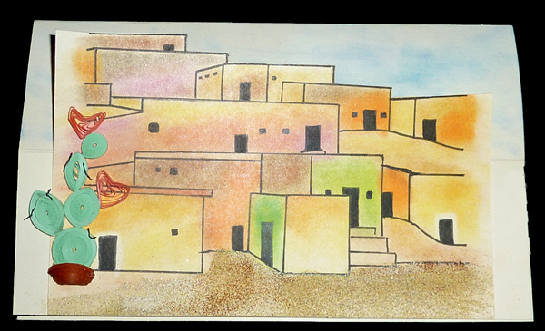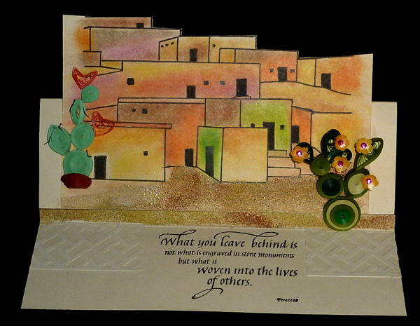 I found this gorgeous adobe image on line and used it as my inspiration. I drew the outline of the adobes and then outlined them with a Zig Writer, colored the buildings with Pan Pastels and then added the windows and doors with a Pentel pocket brush. The bottom street area is Distress embossing powders (Old Paper, Vintage Photo & Antique Linen), which gave it a nice sandy look and feel. Just perfect for cacti. I added punched flowers on the cactus to the right with a rose toned rhinestone center. I also backed that cactus on some cardstock for strength. On the left cactus, I added little black needles. I stretched a piece of black cotton thread on my craft mat and applied a layer of white glue, let that dry, which gave it a stiffness, l making it easier to handle and glue to the cactus. Punched out the Brick Pattern (EK Success) from the cream toned cardstock, and added the same embossing along the small lip. Stamped the quote with Versafine Black Onyx. |