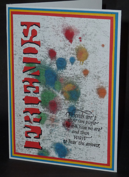 This background was a pleasant surprise and it's also the back of the piece I was working on. I had melted crayons on my dirty craft sheet, lay my cardstock over it and ironed away. It picked up the colored texture of my mat and I loved the splotches. The front side was more harsh. I just loved the whimsy of this background. I die cut the word Friends (Tim's Sizzix Movers and Shapers die) into the background. Die cut another one from some black cardstock and off set the two pieces giving it a shadowed effect. I then layered these onto my red cardstock, then onto the yellow, then the blue and finally on to my white card. It's extremely rare I do this much layering, but I was really into the whimsy of it. BIG GRIN. Stamped my quote with Versafine Black Onyx. |