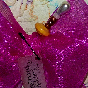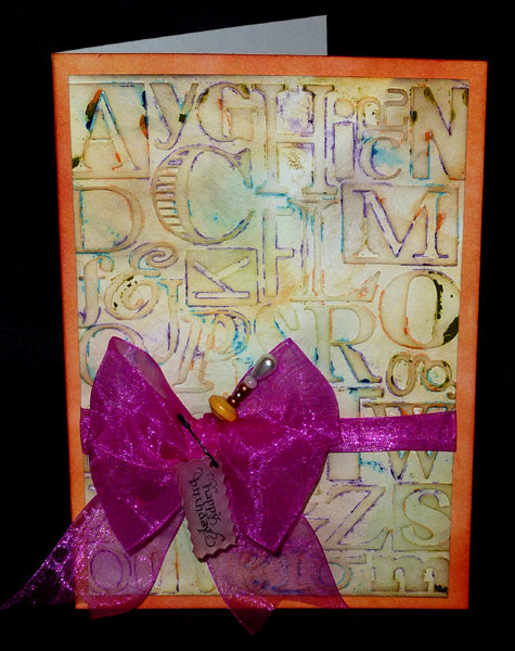 I ran my crayons over my embossing folder (Cuttlebug "Typeset" #2000204), misted my paper with water (110# white cardstock), placed the cardstock in the folder and ran through my machine, removed the paper and dried it. I then sponged Distress Wild Honey around the edges, then a touch of Walnut stain and then touched a few places with Broken China. I was in a very colorful mood... My main card is white and I sponged the Honey and some Barn Door around the edges. Tied a double peg bow with the 1.5" wide fuchsia colored gauze ribbon and adhered it to the alpha background, anchoring it on the back, then adhered the background to the card front. Stamped my sentiment onto Shrink Plastic with Versafine Black Ony, trimmed the edges with a zig zag rotary cutter, punched a 1/4" hole and then shrunk with my heat gun. attached it to my bow with a safety pin. Added a bunch of beads to my pearl headed hat pin, ran it through my bow and added more beads with the last one I adhered it with Glossy Accents so you can't get pricked by the pin... |