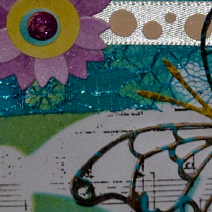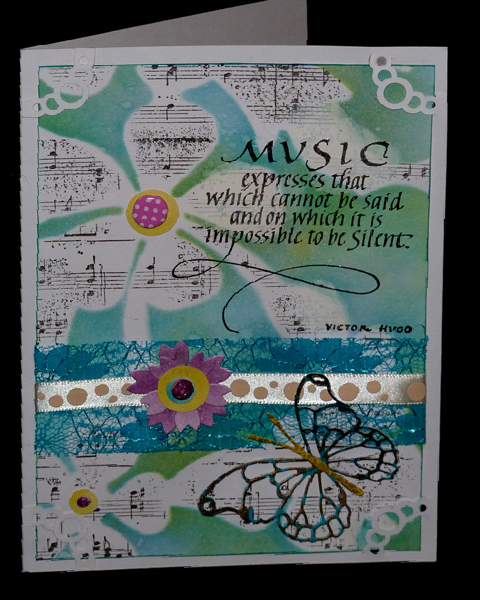 Created: June 14, 2012 I came across this large plastic floral/butterfly screen in Dollorama and thought it would make a great stencil... and it did. I scanned the portion I was going to use and created a negative image, adjusted some of the design so my new stencil/mask would stay in one piece, cut with my electronic cutter, lay it on my white cardstock and rubber stamped the music background stamp (Cornish Heritage Farms) with Versafine Black Onyx. Then overlayed the original screen and sponged Distress colors (Shaded Lilac, Broken China, Evergreen Bough & Squeezed Lemonade) misted with water and dried. I'm using the Music stamp quote from Quietfire Design