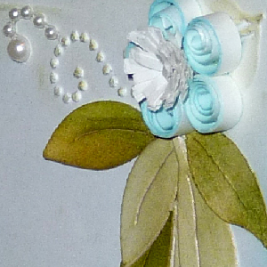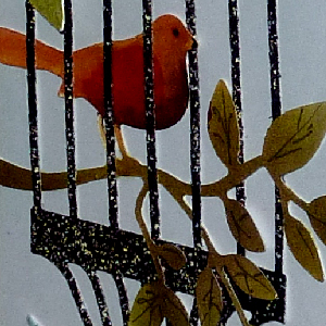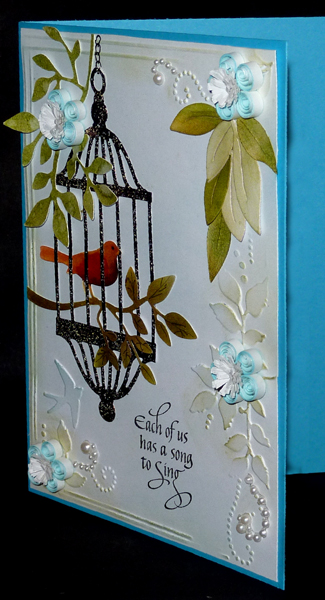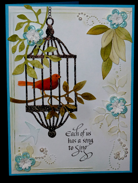 I had cut a bunch of white pearlized quill strips and then colored the back of them with a light blue Tombow marker. I used my Quilled Creations fringing die for the centers. Makes life soooo easy... Birdcage (Memory Box "Carousal") was die cut on 110# white cardstock, direct to paper with Versafine Toffee and embossed with a combination of Judi Kins Rustique Tin can & Rustique Antique Iron. I embossed (Sizzix set #656503 "Birds, Flowers & Branches) the white cardstock using my hard rubber mallet and selectively embossing parts of it. I continued the embossed lines with my Scor-It tool. Sponged Distress Broken China and Crushed Olive very lightly over the high points. Adhered my background to my main mid toned blue - it matches the inside of the coils perfectly. Die cut my bird (Marianne Designs LR0138), sponged with Distress greens and colored the bird with Distress markers, adhered inside my birdcage and then onto my card. Then adhered my leafy and floral elements. On the right was the largest leaf from Cheery Lynn Tropical Foliage cut up. On the left was a Sizzlets Leafy Branch. Stamped the quote with Versafine Black Onyx and added some white half pearl flourishes. |