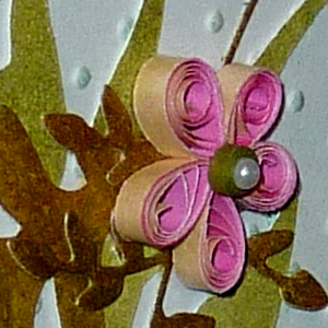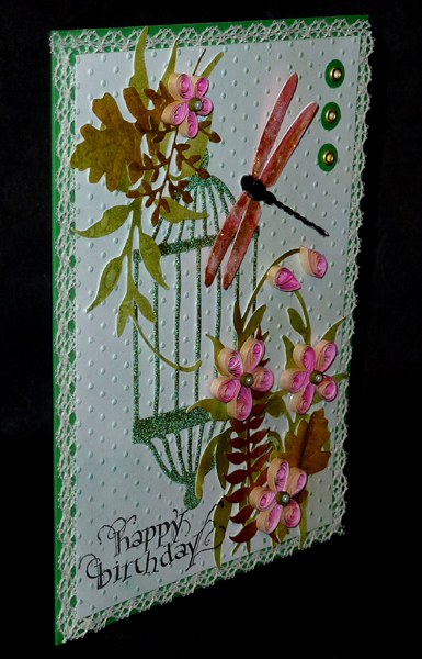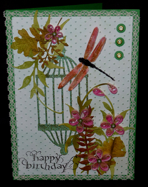 I had cut a bunch of cream pearlized quill strips and then colored the back of them with a light pink Tombow marker. The dragonfly (Memory Box "Meadow Dragonfly") was die cut from white cardstock colored with Distress pinks prior die cutting, assembled, then hit with a glue stick and sprinkled with Ritz micro fine glitter "Warm Highlights". The body was done with white glue and dark brown and black flocking. I embossed (Cuttlebug "Swiss Dots") the white cardstock. Sponged my dirty blue sponge over the high points. Punched a 1/8 hole in my green cardstock, then punched a 5/16" circle keeping the previous punch in the center. Inserted my gold eyelet, hammering the back flat, then adhering it to my background piece. Adhered my ecru lace edging around my main mid toned emerald green card front. Adhered my background, then my Birdcage (Memory Box "Carousal") was die cut on 110# white cardstock, direct to paper with Versafine Spanish Moss and embossed with a Judi Kins "Rustique Patina Jade". Adhered my dragonfly and leafy/floral elements. On the left was a Sizzlets Leafy Branch; Oak leaves electronically cut after scanning some real oak leaves; and Marianne Designs "Leafy Branch". Used the same dies for the bottom leafy elements adding a sprig Dee's Distinctively "Large Fern"; Stamped the sentiment with Versafine Black Onyx and added a small white half pearl in the centers of the flowers. |