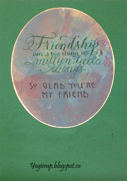 Created a background with Distress Oxide sprays on white cardstock. Stamped the quote using Versafine Clair "Green Oasis". Wrote in my "So Glad You're My Friend" using a black Zig Writer. Die cut with Spellbinder's Oval die set. Adhered to inside of card.