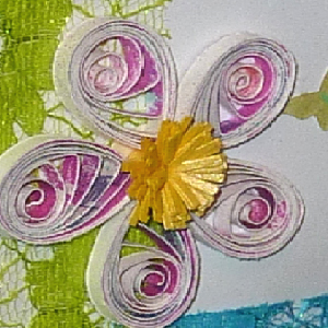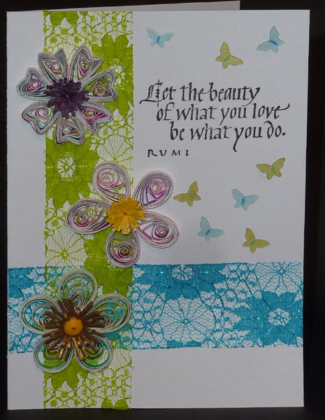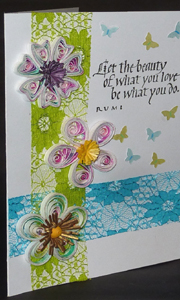 I had made a background on white cardstock using Dylusions dye inks, gesso, stamping etc - and didn't like it. It just wasn't me... although the color combination was really nice. I'm not one to throw things away, so it was going to end up in the proverbial drawer to languish away... Then I said, why not cut some quill strips and see how that goes, and voila, I made these 3 flowers, plus another one and a butterfly and I still have some cardstock left over. I really like the results, so I guess I'll be cutting up some other backgrounds in the near future. I also used one of my newest dies from Quilled Creations to make my fringes in the center. Picked up the lace ribbons from Paper Pastimes, which I thought really lent it self to the summer feel of the card. The little butterflies are drop outs from the Spellbinders Butterfly Circle die and I sponged Distress Broken China and Shabby Shutters on them and added a co-ordinating colored pencil body. Stamped the quote with Versafine Black Onyx. |