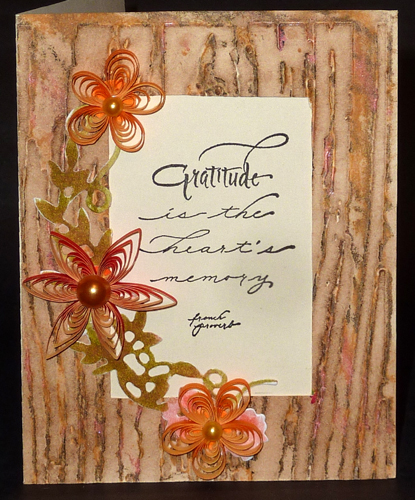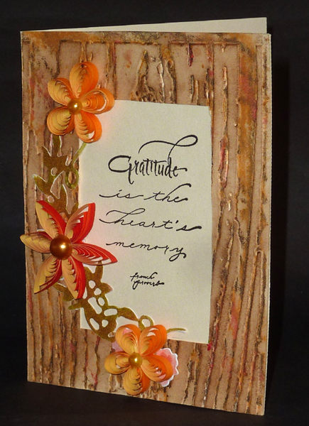 I recently acquired a 28 pce set of Faber Castell Gelatos - fun. They're water soluble and work fantastically on embossing folders. I ran my various colors of gelatos on Tim's texture fade "Wood Grain", first with an ochre, then a deep brown, then touched it with a salmon/orange, misted my 110# cream toned cardstock with water, inserted it into the folder and embossed it. Dried it, then cut out the center to create a 1" bordered frame. Adhered it to my card front, then adhered the Marianne Designs Garland piece, then my quilled flowers Stamped the quote with Versafine Black Onyx. |