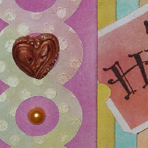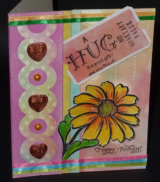 Another challenge was circles or stripes, so created a background paper stamping the images (Hampton Art Graphic Border set & Glitz Design Clear Distressing set) with Perfect Medium and embossing with white embossing powder, then coloring with Pan Pastels. Punched out the circle border with an EK Success deep edger Le Circle. Adhered it to card front and added the heart buttons which I made from polymer clay eons ago and painted with copper paint. Added yellow half pearls in the other holes. I stapled the accordion folds down using Tim's Tiny Attacher, then covered the staples with double sided tape and various colors of narrow ribbons. Punched out the ticket (McGill Tall Ticket) from white cardstock, colored with the Pan pastels and stamped the sentiment (Local King Rubber "Froggie") and the No Monetary Value with Just Rite alphabet stamps using Versafine Black Onyx. Stamped the large flower on white cardstock with the black, clear embossed and colored with Derwent Inktense watercolor pencils, then cut out separating the stem from the flowers and reassembling. Adhered to card with 3D foam dots. Stamped the Happy Birthday with the black. |