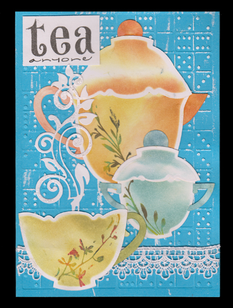 Adhered a piece of white lace on the bottom, adhered my teapot, sugar container and cup and placed my steam strategically. Stamped the word TEA using Hero Arts Happy Letters alphabet set, and wrote in the word "anyone" with my micron pen. |
