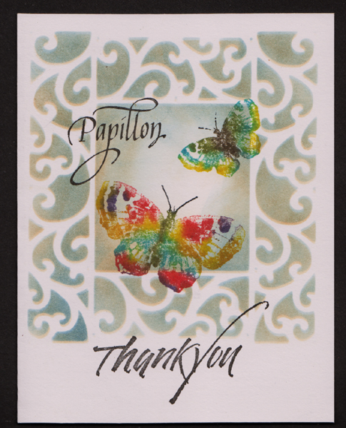 sponged more colors giving me a slight shadow line. Today, one of the techniques in Tim's online class "Chemistry 101" we made a custom stamp pad (you can see my class Post HERE), so I figured I might as well use it in real life BIG GRIN. Love the way it turned out. The butterflies are also Quietfire Design rubber stamps. And I really like the way they stamped onto my stencilled background. I stamped the sentiment and word stamp with Versafine Black Onyx. |