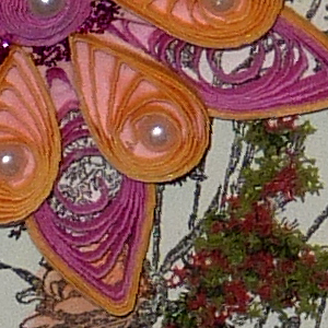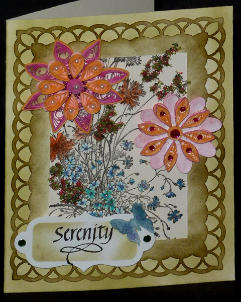 I like the feel of using the cardstock for my quilling. I'm able to get a less tight coil. I also like the very narrow quill strips, doesn't make the flower quite so thick. I used a cream toned cardstock and sponged Distress Shabby Shutters around the edges. Punched a rectangle shape from white cardstock using Martha Stewart around the page Layered Arches punch set. Sponged Forest Moss all over, dried, then applied Perfect Medium to just the scalloped edges and clear embossed, then cut out the internal rectangle. Stamped the wildflowers (La Blanche), painted some of the floral elements with watercolor paints, dried and adhered the frame. Quilled my petals with a bright yellow and bright pinky tone, some had the other color quilled around the petal. Die cut couple of sizes of the scalloped flower (Heartfelt Creations) from pink cardstock and adhered my quilled petals, adding rhinestones or pearls in the hole of the quilling. Adhered to card. Added a bit of stickles magenta to the flower on the left. Adhered some green/red flower soft to some of the weedy sprigs. Added some blue stickles to the painted little flower centers. Stamped the word Serenity with Versafine Black Onyx and die cut with Spellbinders Grommet Tags, sponged some green around the edges and adhered to card with 3D foam dots. Added the little green dots to the grommet area. Punched the butterfly (Martha Stewart) from white cardstock, sponged with Broken China and smeared with blue stickles. |