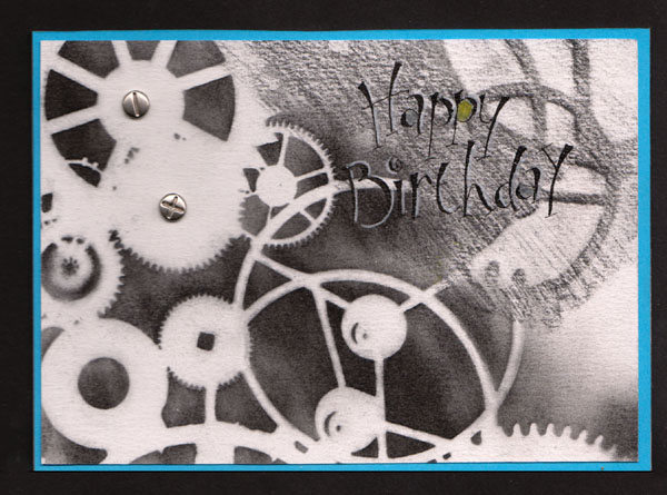 I used the Crafters Workshop 12 x 12 "Gears" stencil, first underneath my paper (St Armand mold made paper) and with the flat of my 4B pencil colored over the stencil. Then put the stencil on top of the pencil work and used a kneaded eraser to remove a majority of the pencil work. (right upper half of card). Then with my stencil on top, pounced black Pan Pastels with a soft bristle brush. Sprayed with workable fixative. Wrote in my Happy Birthday with a pointed pen/Nikko G nib and Moon Palace Sumi ink. When dry outlined with a white colored pencils and colored in a few of the letters. Layered it onto a mid toned blue cardstock. Added the "screw" shaped brads, then layered it onto my top fold white card. |
