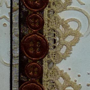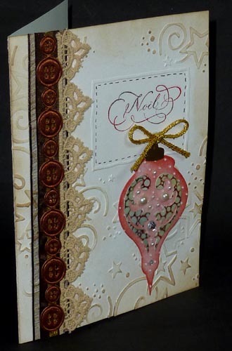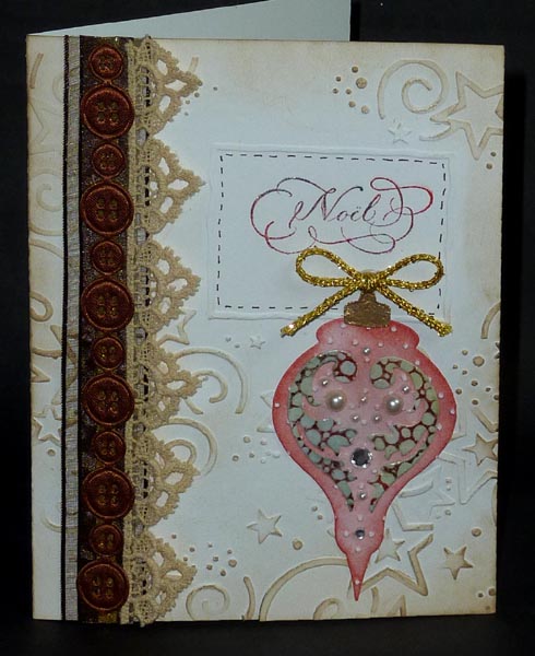 I ran my card front through my machine with the Crafts Too embossing folder "Stars Frame" on its side. I needed to put more of those stars randomly around, so cut the folder apart and re-taped it on the other end, then used my rubber mallet to emboss selected areas. Sponged a touch of Distress Frayed Burlap around the edges. Stamped my sentiment using Distress Barn Door and lightly tapping the stamp with Evergreen Bough. I love two tone stamping, just gives it more character. Adhered several pieces of ribbon on the left side, one wider brown satin/gauze ribbon, then the lace picot edging, then the buttons, then I sprinkled some Ritz micro fine glitter onto the exposed adhesive. Die cut the smaller ornament (Ornament #2) from white cardstock, sponged Barn Door all over, ran through my machine with Cuttlebug Swiss Dots, sanded the high points. Die cut the flourishes (Flourish #1) from white cardstock and while the pieces were still in the negative space, stamped them with Impression Obsession CAC "Bubbles" stamp inked with the red and green and misted with water. Dried. Removed it from the negative area, lightly sponged some green around the edges and clear embossed. Inked the ornament holder piece with Versafine Toffee and embossed with Queen's Gold. Adhered to ornament then to card, adding a gold cord. Added white half pearls and rhinestones. Final touch, adding brown faux stitching around "Noel" with a Zig Writer. |