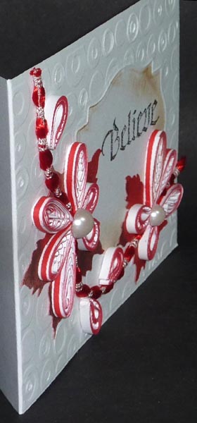 I Created an embossing diffuser using Spellbinders Label 18 die and mat board. Ran through my machine using Cuttlebug "Circle & Dots" embossing folder, and because I was using the diffuser, it only embossed around the edges. I then used the die and a tan mat to emboss the Label design into my card front. I die cut another Labels #18 from cardstock to use as a stencil and sponged some Distress Frayed Burlap around the edges of the label design. Adhered a piece of red twisted ribbon ( I think I got from Reasonable Ribbons) to act like a stem for my flowers. Used normal white quilling paper, ran through my gadget to edge it with red, using a Zig Writer, then used a quilling comb to create the larger petals. I surrounded each of those petals with a red thin quill strip cut with my pasta machine on the linguini setting. I like the candy cane stripe effect it gives. The bud type petals were also edged in red, loose coils and then fold in half, which pushes the coil design around the edges. Added large white half pearls. Stamped the sentiment with Versafine Black onyx. |
