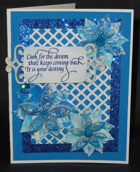Created: November 11, 2012 I was going through my stash of quilled elements and came across a flower I had made and some extra quill petals and remembered there was a challenge that asked to use blue and white... I'm also using a lovely quote stamp from Quietfire Design