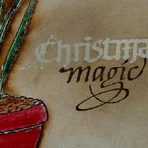 I kept this card simple as well, Stamping the flower (Penny Black "Amaryllis") with Versafine Black Onyx and clear embossing. Stamping the "Christmas" word with perfect Medium and clear embossing. Coloring with a mix of watercolor pencils and Tombows on CP watercolor paper. Sponged Distress Walnut Stain around the edges. Ironed off the embossing from the word only, then stamped my word "Magic" with the black. Adhered to my white card front. Added gold Peel Off corners and Glossy Accents to the vase. |