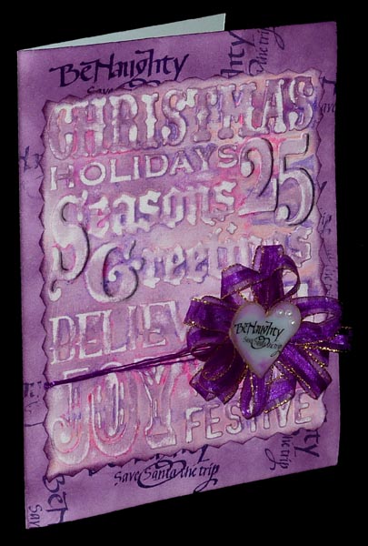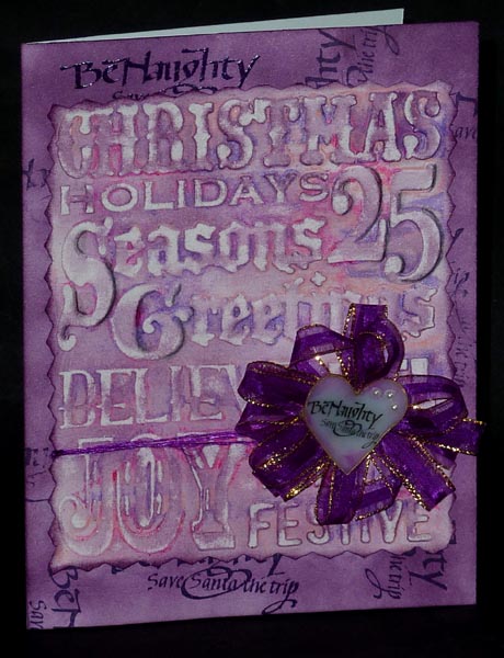 I colored the embossing folder (Sizzix Christmas backgrounds & borders set "Holiday Print") with the Gelatos in various shades of pink and then added purples, misted heavily with water and then ran it through my embossing machine. (Used 110# white cardstock). Dried. Sponged Distress Seedless Preserves over all the high points, then sand it down. Added a pencil line shadow on a couple letters and numbers and blended it with a paper stump. Used a zig zag blade on my rotary cutter to trim the edges, then sponged the edge with the purple. Recycled the bow from I don't know where... and it also had a thin fibre thread which I wrapped around the background. Stamped the sentiment on some lightly sanded white Shrink Plastic with Versafine Black Onyx. Colored the edges with a pink Spectrum Noir pen, blending with my finger, then edged with a Krylon Gold Leafing pen, then shrank it. Adhered to bow with Golden's extra heavy gel medium and added some small white half pearls. Sponged the purple around the edges of the card front, then dried it. Stamped the sentiment on the top and bottom so it would be visible when the background was added, with Versafine Imperial Purple and clear embossed it. Then repeatedly stamped the sentiment in different directions. Adhered the background. |
