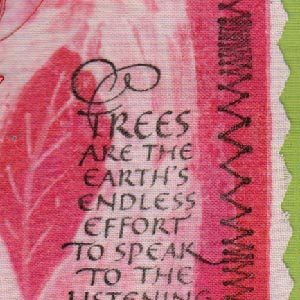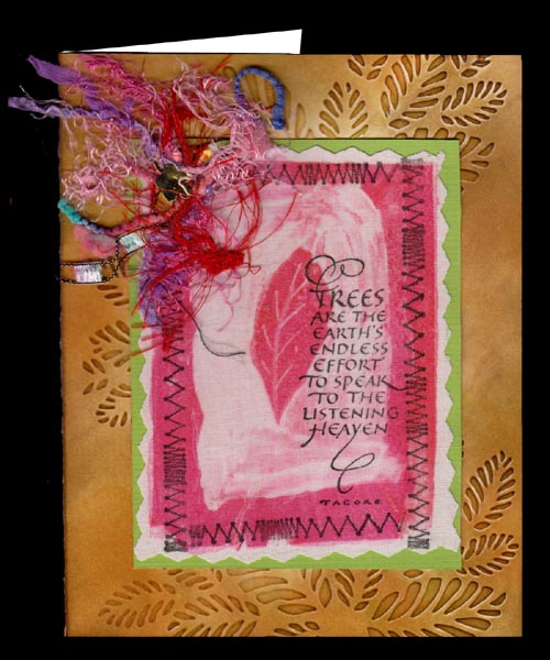 I used black acrylic paint on a piece of .007 clear plastic for my leaf design. A Sharpie or other alcohol based pen can be used, but I find it's easier to paint out all the little spots a Sharpie creates. I set my negative aside. I taped a piece of white cotton to my craft sheet, then painted on the Inkodye. it comes in 3 colors, that I think are orange, red (or maybe pink) and blue. Wish there was yellow... Anyway I painted the orange in a streaky fashion, then streaked the red (which really looks like pink), lay my negative over it, and then a piece of glass to hold everything down. Set this outside in the sunshine and 10 minutes later, brought it inside. Rinsed/washed it thoroughly. And that's it. I also dried it with my heat gun and then ironed it, not necessary, but I was impatient. Used a zig zag rotary cutter to trim my fabric. Stamped the zig zag stitch (Tim's "Spring Sprung") with Versafine Black Onyx. Stamped the quote with the black and clear embossed it. Adhered it to a piece of textured green cardstock. Put a bunch of tiny yarn scraps onto a 5/8" punched circle with some Golden's Soft Gel Medium, punched a hole through it and the leafy piece, then attached the yarn circle with a gold leaf brad. Embossed my white card front with Crafts Concept "Leafy Flourish" embossing folder. Sponged Distress around all the edges (Scattered Straw, Dried Marigold, Vintage Photo, Crushed Olive). Adhered my leafy piece.
