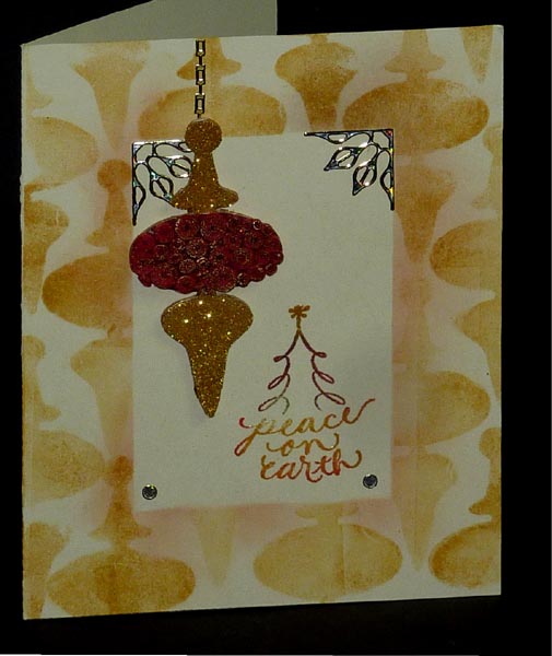 I put some Sookwang tape on a piece of 110# white cardstock and die cut with a Sizzix Movers & shapers ornament die. Removed the release paper from the center part of the ornament and adhered my tight red coils. (I'm using the 1/16" made with my pasta machine on the linguini setting). When all were adhered, I sprinkled Ritz Micro fine glitter in "Regal Red". Then lightly hit the top of the red coils with a Versafine Toffee stamp pad and embossed with Queen's Gold. Removed the release paper from the rest of the ornament and sprinkled with more gold glitter. I found the ornament a bit flimsy, so die cut another one from chipboard and adhered the two together. Die cut another bauble from a piece of fun foam to use as a stamp. Made a rectangle mask to give me a 1 border all around, lightly adhered it down, brayered my foam with the Toffee, stamping first, second and third generations to give variance. Sponged a bit of red around the edges of the mask for more definition using a dirty red Distress sponge. Removed my mask and stamped the sentiment with Toffee all over, then hit portions with Satin Red & Olympia Green, stamped and clear embossed. Adhered some holographic Peel Offs in the corners and a couple dots at the bottom. Adhered my ornament and added a Peel off chain. |
