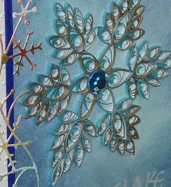 And again I kept it simple. Stamped my snowflake word with Perfect Medium and clear embossed. Sponged with Distress blues, misted with water and dried. Stamped my wonder word with black. Ironed off the embossing from the snowflake word. Embossed the card front with Cuttlebug Swiss Dots, adhered my blue layer. Adhered a narrow dark blue ribbon. Die cut the snowflake border from some decorative paper in my stash. The quilled snowflake uses quill papers cut from a medium blue pearlescent wrapping paper cut with my pasta machine on the Linguini setting. I edged the strips with a Gold Krylon leafing pen using a little gadget I made to hold my quill strips perpendicular.... GADGET: two pieces of thin MDF - but chipboard can be used - glued to a thicker piece of wood. The two thin pieces are butted up to each other, leaving just enough space for the thickness for paper to slip through. Then holding your gold pen at one end and touching the edge of your strip, pull the strip through the gadget. Adhered the quilled snowflake, adding a medium sized blue rhinestone. |