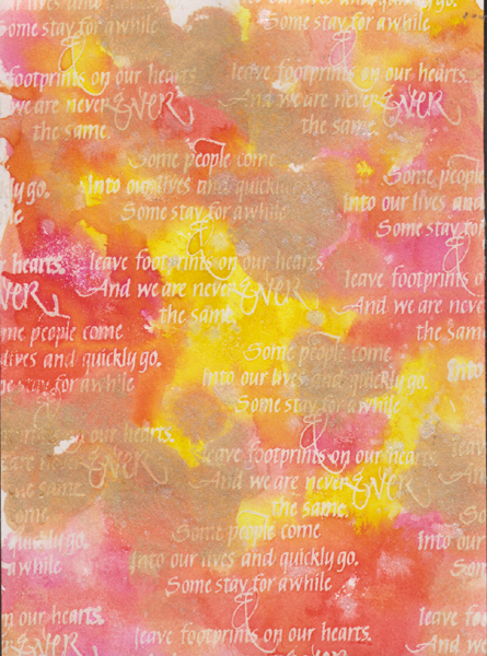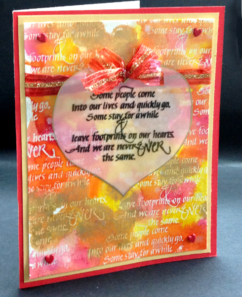 For the background, I repeatedly stamped the quote using Versamark on 90# CP watercolor paper and clear embossed. Then dabbed Distress Stains all over in "Mustard Seed", "Picked Raspberry", "Ripe Persimmon" and a bit of "Tarnished Brass", then misted with water, tilted my paper and let it do it's thing... Set aside to dry. Trimmed it to size. Side folded my cream card. Layered a piece of red cardstock, edge to edge, then a mid toned yellow leaving a scant border all around. Stamped the quote with Versafine Black Onyx on a piece of pink toned vellum and clear embossed. Cut by hand in the shape of a heart and edged it with a Krylon gold leafing pen. Cut some slits to thread my red Sari Ribbon through and wrapped the ends around my background piece. Note: I did not adhere my heart, it's only held on to the card with the ribbon. Tied a bow separately and adhered it to the heart. Inserted some red heart brads in the corners and then adhered my background to the card.