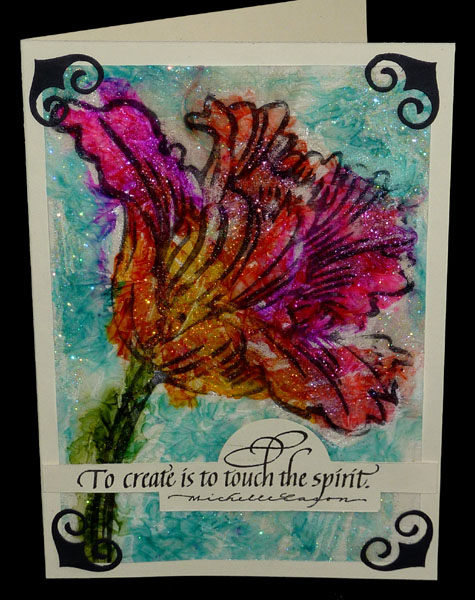 So stamped my jumbo tulip (Inkadinkado) onto the clear plastic using Staz-On black and clear embossed. Note: I tried with Versafine and it never dried even after 24 hours... so wiped it off and re-stamped) Note: make sure your plastic is larger than you need, so you don't get the inks and Diamond glaze seeping underneath, I didn't find my Diamond Glaze so used 3D Crystal Lacquer. I put several blobs in various areas of my flower and dropped alcohol inks (butterscotch, raspberry) into the blobs in the colors for my flower, and then my stem (meadow). Using the tip of a bamboo skewer, smeared and moved the blobs around. Added more blobs of lacquer and the blue (Pool) of the background, smeared it around, then sprinkled with Distress fine glitter "Star Dust", then scrunched up a piece of white tissue paper, un-scrunched and lay it over the whole of my background, leaving some of the wrinkles for texture. Set it aside to dry completely. Trimmed it down and adhered it to my cream toned card. Die cut the corners from black cardstock, using Cuttlebug "Ornamental" die set. They're the negative pieces... Adhered them to the card with the lacquer. Stamped the quote on a scrap piece of cream cardstock and clear embossed. Trimmed it around the quote and used a circle die from Spellbinders and my hard rubber mallet to cut around areas. Adhered to card with the lacquer. |
