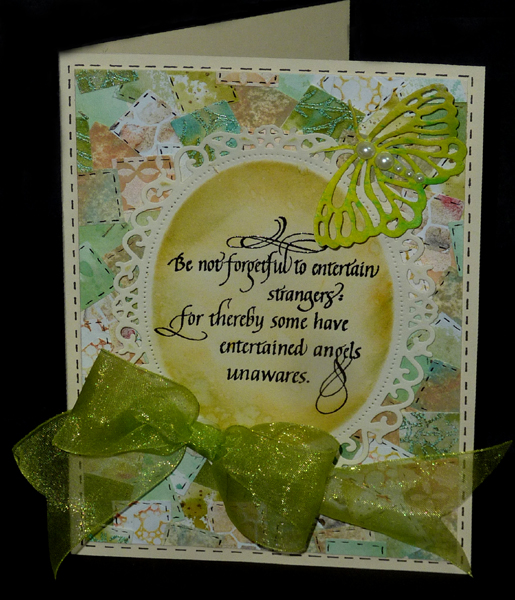 So I raided my scrap drawer of decorated papers in green tones and punched a whole bunch of 3/4" squares using an EK Success slim punch. I then adhered them to the cream toned cardstock, avoiding the middle area since it would be covered with the quote. When everything was adhered, I then did faux stitching using a Micron pen. Trimmed my background down and adhered to my cream toned card front, then did faux stitching all around. Stamped my quote on another lighter toned cream cardstock using Versafine Black Onyx and clear embossed. Die cut with Spellbinders "Floral Ovals" using a piece of Tyvek between my die and cardstock. The die cut just pops out beautifully... PS you can use the Tyvek over again in the die or color it and use it on a card. Sponged Distress "Shabby Shutters" and a touch of "Mustard Seed" around the edges and adhered to card with 3D foam squares. Tied a peg bow from 1.5"w green gauze ribbon and adhered to card with Golden's Extra Heavy gel medium. Dug into my stash and pulled out a matching green butterfly (Cottage Cutz "Filigree Trio"). Added some white half pearls to the body. |