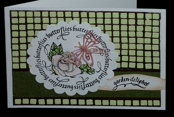 I side folded my white cardstock. Applied Sookwang tape, keeping a 1/8" border all around. Started adhering my drop out squares (light mint Bazzill monochromatic cardstock) and leaving a space between them. I also added a piece of green Ruche paper (I ran out of little squares...). When done, sprinkled with Glitter Ritz micro fine glitter "Bronze", burnished well. Stamped the butterfly circle with Versafine Black Onyx and clear embossed. Die cut with Spellbinders Classic Scalloped circle large set. Used tracing paper to make a stencil/mask of the inner portion of the circle so I could stamp the flower sprig (Flourishes "Magnolias") also with the black. Colored with Prisma. Stamped a portion of the garden Delights stamp and hand cut with a wavy contour. Sponged a bit of brown on the edges and adhered to card. Adhered the circle. Die cut the butterfly (E Craft Designs "Small Butterfly") from white cardstock. Sponged distress Worn Lipstick, then applied Perfect medium and embossed with Stampendous Stamp 'n Bond embossing powder. Sprinkled Ranger's Stickles Fine Glitter "Stardust" and reheated to set. Adhered to card with a foam square.