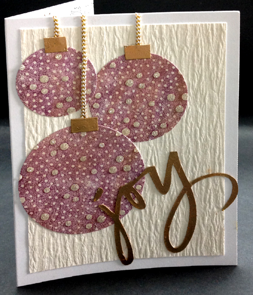 I side folded my white card and adhered a piece of Ruche white cardstock, leaving about 1/4" border all around. The balls were made first by stamping a background stamp (Penny Black "Crystal Patterns") using Distress "Dusty Concord" all over the stamp, misting the stamp with water and stamping on to a piece of white cardstock, leaving the stamp in place to activate the moisture with the ink. When dry, rubbed a Versamark pad all over and sponged Pan Pastels Metallics gold (hard to see in the pic but it adds a nice color layer), die cut the balls in 3 sizes using a Spellbinders circle die set. Cut a rectangle strip, inked with Versafine Toffee and embossed with Queen's gold, then cut off pieces for the hangers. Adhered the balls in place without gluing the hanger sections. That way I was able to glue the strings and hide the ends under the hangers. Electronically cut the word "Joy" from white cardstock, inked with the toffee while still on the mat, removed if from the mat and embossed with the "Queen's Gold". Adhered to card. Final touch on the the 1st card was to add dots of Viva Silver Glitter Pen. |