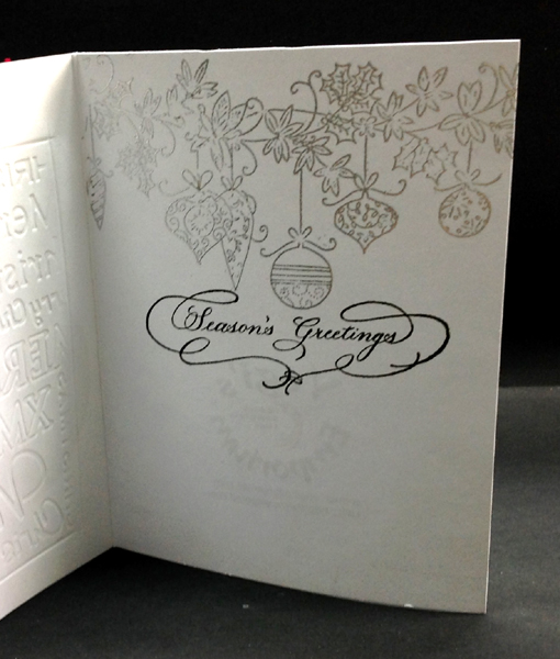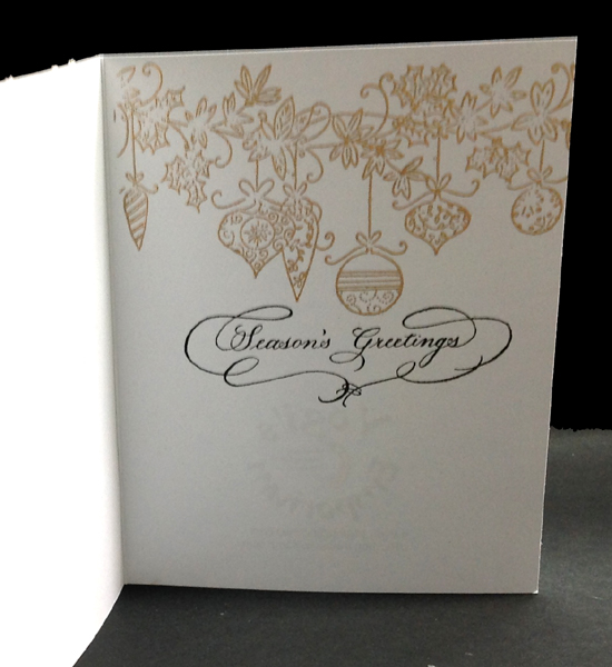 On the inside stamped the ornament border (Lili of the Valley "Christmas Baubles") using the toffee and embossing with the gold. Stamped the sentiment (Quietfire Design) with Versafine "Black Onyx" |