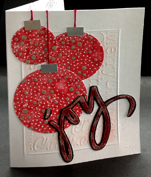 Embossed the center portion using a diffuser and the Craft Concepts "Merry Christmas" embossing folder. Lightly sponged some Distress red using a dirty sponge. The balls made the same way as above using "Festive Berry", and silver embossing powder for the hangers. The word joy was embossed with Stamp n Bond, and Glitter Ritz micro fine glitter applied (some Ruby Red & Star Dust). Word was layered on to a shadow e-cut sponged with Distress Black Soot. Final touch used a Quickie glue pen and more Ritz silver glitter for the dots. |