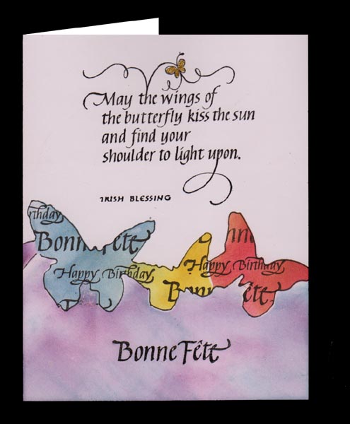 Created: February 1, 2013 I love Tim's on edge die of these butterflies... I'm using several stamps from Quietfire Design - Butterfly Circle Set "May the Wings..", Francais set "Bonne Fete", 10 tiny tag sentiment set "Happy Birthday" |