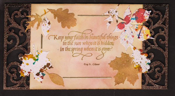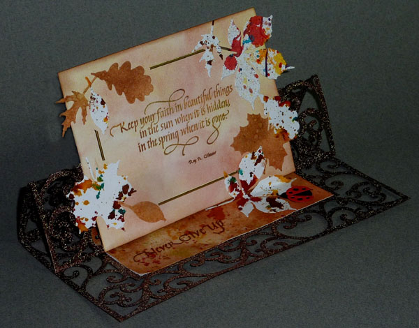 The brownish leaves are sponged Distress pads (Scattered Straw, Crushed Olive, Dried Marigold) spattered and misted with water and dried. Both backgrounds were die cut with Impression Obsession "Fall Leaves" die set. Adhered in a pleasing arrangement to front. Added a gold Peel Off line. Floor of easel is the brown background piece but some Distress Stains spattered onto it. Cut to fit the area. Stamped the sentiment with Versafine Vintage Sepia and clear embossed. Adhered to floor. Adhered half of the large leaf as a stopper , scoring and folding it