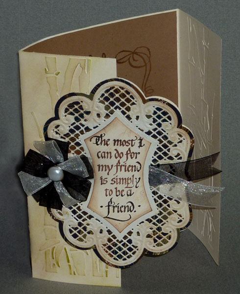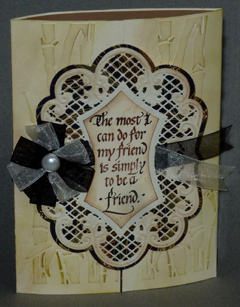 I scored my cream cardstock at the 2.5" and the 7.5" points, then trimmed down the center where the sides meet to get a perfect fit. Embossed both sides with Cuttlebug "Bamboo" 5 x 7" embossing folder, using the "off the edge" technique to only emboss the front of the card on the right flap. Lightly sponged Distress Crushed Olive over the high points. Die cut the lattice piece from cream cardstock and used the rubber mat to emboss the designs as well. Lightly sponged using my dirty brown sponge over the edges. Die cut the underlayer from Chyiogami paper (fall colors/leaf pattern) and adhered to my lattice piece. Stamped the quote with Versafine Vintage Photo and touched areas with Black Onyx, clear embossed and die cut with the center die of the set. Sponged again with my dirty brown sponge and adhered to lattice piece. Cut another cream toned underlayer piece and adhered to lattice assembly. Adhered the lattice assembly to the front of the left side. Cut another cream toned underlayer and adhered it to the inside of the card, matching the edges and only adhering to the front flap edge. This leaves a pocket type opening for the right side flap to fit into to keep card closed. Created my bow by making several loops from black and cream toned gauze ribbon. Cut ribbon to 4", adhere to form a loop with a small piece of Sookwang tape. |