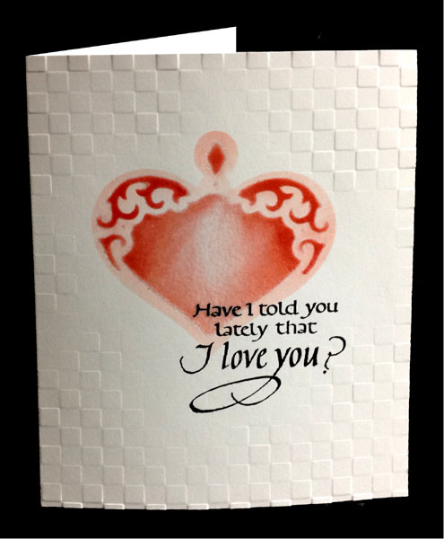 Side folded the white cardstock. Die cut the heart (Spellbinder's "Nested Hearts" set) from white cardstock to use as a stencil and a mask. Lay the die cut drop out piece on my card where I want the design to land. Taped it at one corner with removable tape. Lay the stencil down positioning it to fit around the heart. taped the stencil down with removable tape, and then removed the drop out piece. Positioned my die in the opening and sponged with Distress "Worn Lipstick", applying heavier application around the edges and lighter towards the center. Removed the die and stencil and clear embossed. Stamped the quote with Versafine Black Onyx and clear embossed. Placed the stencil back in place and lightly sponged some of the red all over. Removed stencil. Embossed the background using the Cuttlebug "Everyday" combo pack "Checkerboard embossing folder and my fingers. How to: arrange the embossing folder with your cardstock inside the folder. Work on a section of table where there is a sturdy leg. Press down with your thumbs in the area you want embossed, then put your whole weight into pressing down. You are almost balancing only on your fingers. It will leave a nice impression. Continue same procedure in other areas till complete.