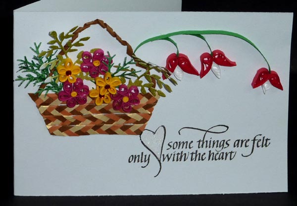 Created: April 7, 2013 I taught a weaving/braiding and coiling class recently, and in doing so created this card as I was demonstrating. It's similar to the one on the classes page, although this one has one less Bleeding Heart and the flowers are different colors... I'm also using a quote from from Quietfire Design
