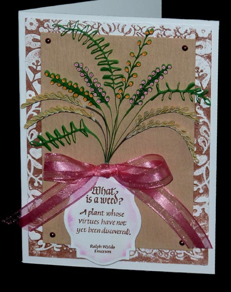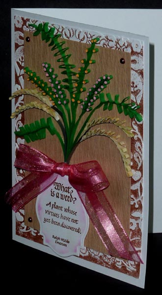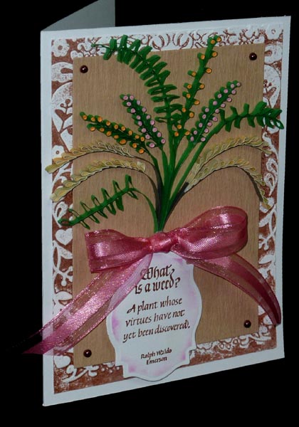 Created: April 7, 2013 I came across an interesting Quill combing technique by Chris on "A Journey Into Quilling" which I then went a step further and created the weed type flowers. I'm also using a quote from the Nature Quote Marks set from Quietfire Design