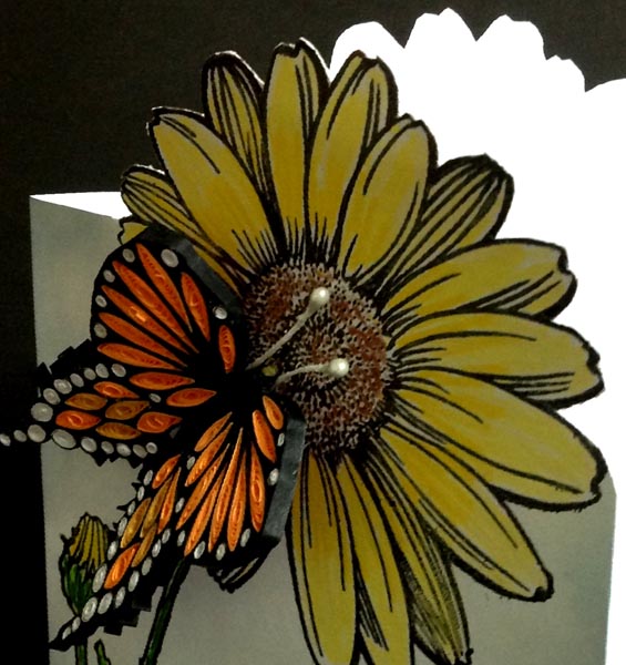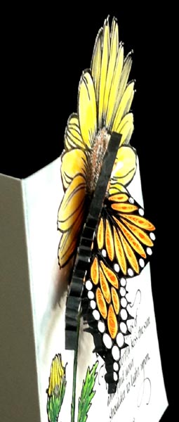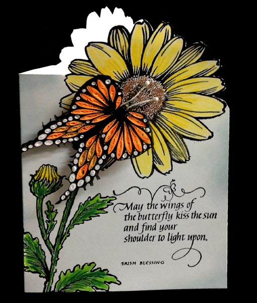 I side folded my white card, stamped the large daisy flower (Stampendous "Jumbo Daisy") with Versafine Black Onyx and clear embossed. Colored the flower with Prisma colored pencils. Then cut around the flower. Stamped the quote with the black and clear embossed. Assembled my butterfly and adhered to card with Golden's Extra Heavy Gel Medium.