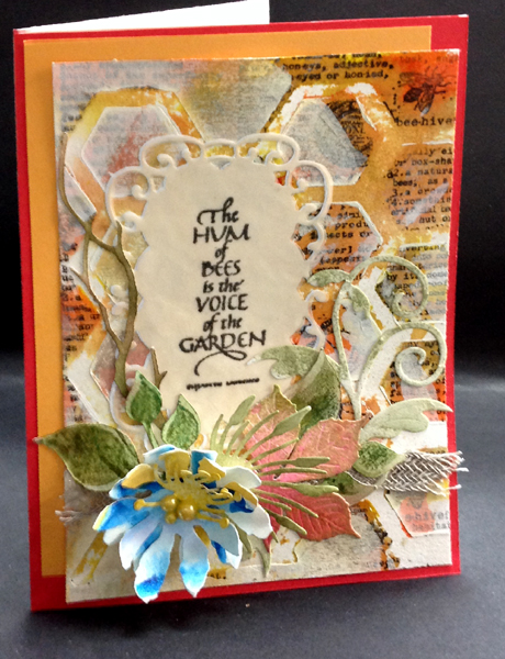 And in that cleaning phase came up with a honeycomb stencil I had made quite a while ago... Lay the stencil down on white cardstock and swiped Distress Stains across it, lifted off the stencil and misted the paper a bit. Dried. Lay stencil back down and stamped the background stamp (Darcie's) through the stencil using Versafine Black Onyx. Then using a large Catalyst wedge swiped gesso (Utrecht brand - very thick) through the stencil. Removed stencil and allowed to dry. Trimmed down. Side folded my cream card, adhered a red cardstock edge to edge. Then an offset yellow cardstock, then offset my background piece. Stamped the quote using the black on yellow toned vellum and clear embossed. Die cut with Marianne Designs scroll frame. Die cut one from white paper as well and layered the two together, just slightly off set then adhered to card. Checked my die cut bins and came up with all these pieces, some I colored a bit more... Added a piece of Tim's ribbon and some half pearls to the flower center. |