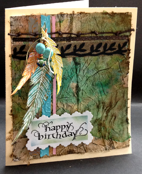 I started cleaning up my upstairs spill over room and came across this piece of tissue paper... Lay a thin layer of Golden's Polymer Medium onto some white cardstock, then pressed my Kleenex into the wetness and used a piece of release paper to press down more firmly. Allowed to dry, then applied a layer of medium on top. Allowed that to dry. Smeared Distress pads over the texture in dark browns, then sponged Metallic Pan pastels wherever it would catch on some stickiness. Side folded my cream card and adhered the background. Wove and adhered slivers from my scrap pile. Tied knots in some dark brown thick twine and adhered that with PVA glue and weighted it down until dry. Die cut the feathers (Sizzix Tim's Bigz die and Movers & Shapers die) from white cardstock. Used a fine tipped stylus to add feather/vein lines, then swiped a Distress pad over the feather. One in "Peacock Feathers" with a touch of brown, one in "Mustard Seed" and the last in "Wild Honey" with a touch of Persimmon. Adhered them together and then wrapped & tied a gold thread around them and onto the knotted cord. The feathers hang loose... Assembled some beads on wire and strung through the loose thread ends. Stamped the sentiment onto white cardstock and cut out with Nellie's "Rectangle 3" die set. Sponged some blue and green around the edges and adhered to card with 3D foam tape. |