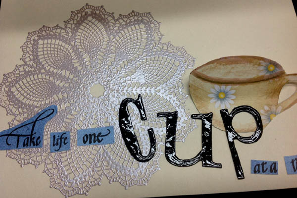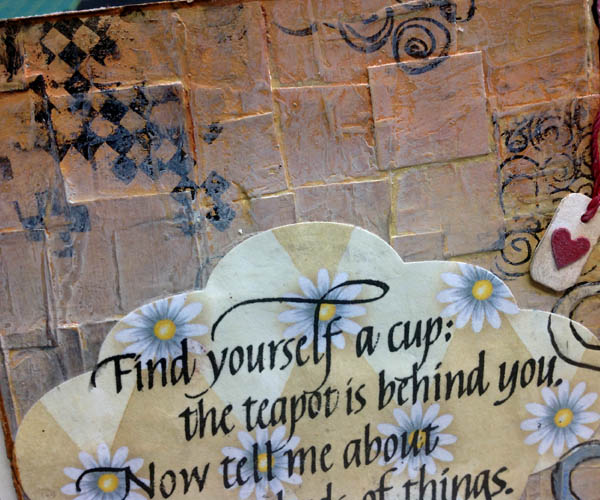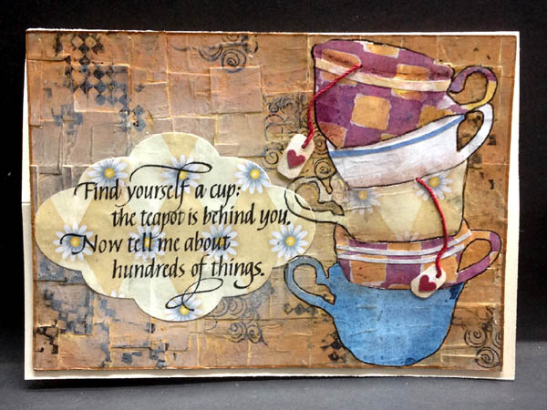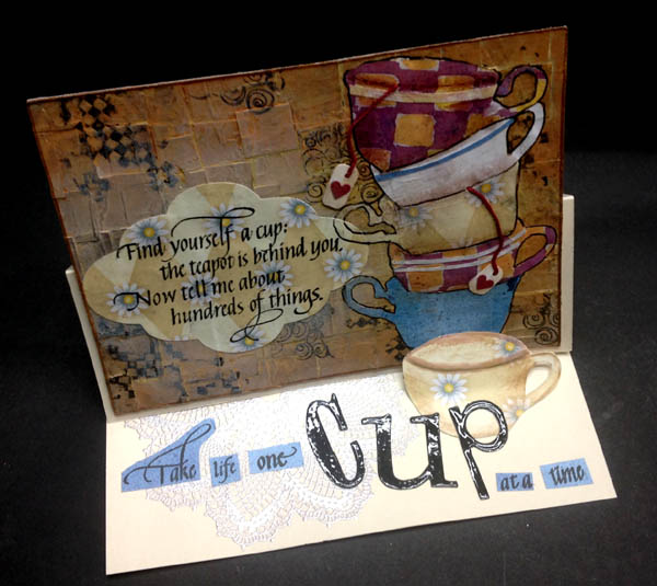 I used Neenah Solar White 110# cardstock for my mixed media layer. Trimmed it down to about an 1" wider and higher than needed. Cut up some yucky scrapbook cardstock that had linear circular design in a yucky color... Can you tell I didn't like that cardstock... Adhered it edge to edge on my white cardstock using Golden's Polymer Medium both as a glue and as a protective coating. Used Distress Paints in various yellows, orange and brown to color over the first layer. Added a bit of Antique Linen to lighten the central portion.. Stamped some doodads here and there (Quietfire Design for the squares pattern & Old Island for the swirly pattern) using Versafine Black Onyx. Heat set. Found some cup images on line, altered them and then cut with my electronic cutter from various scrapbook papers. Cut slits in each one to stack them. Adhered them to the background. Used various markers to shade and accent each cup, then outlined in black. Trimmed the piece down to size. Used the copper Distress paint to color the edges. Stamped my quote on another piece of scrapbook paper using the black and clear embossed. Cut using Spellbinders "Labels Six" die set. Adhered to background. Cut little tags, punched out red hearts (Martha Stewart border punch), punched holes and strung with red thread. Adhered the same floral scrapbook paper to the back of the background then adhered it to my easel. Stamped the lace doily (Stampin Up "Hello Doily") using Versafine Vintage Sepia and embossed with Pearlescent embossing powder. Cut another cup from heavy cardstock covered with the scrapbook paper and adhered to card floor to act as my stopper. Stamped the words from various Quietfire Design quotes using the black on the blue scrapbook paper and cut out, then adhered to card floor. Die cut the word "CUP" using Sizzix Tim's "Word Play" die, colored the letters with a black marker adhered to card floor and applied Glossy Accents. |