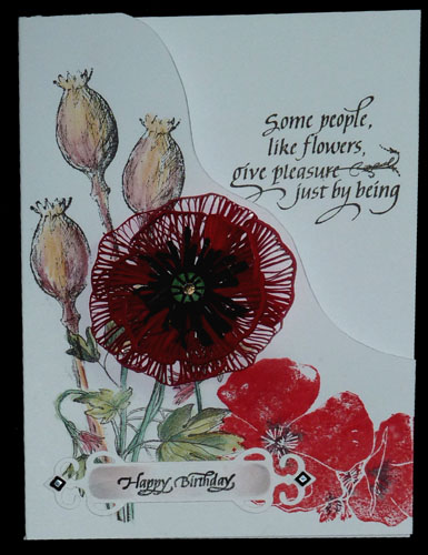 Created: February 19, 2013 I came across a beautifully design poppy done by Manuella and wanted to make one... I'm also using a couple calligraphic stamps from Quietfire Design "Garden Delights" set "Some People like flowers..." & "10 tiny tag sentiments" "Happy Birthday" |