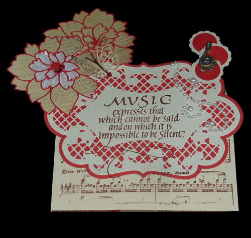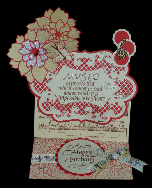 Created: January 26, 2013 I really wanted to use a bunch of my newest dies...BIG GRIN And I'm using several stamps from Quietfire Design - the newest "Happy Birthday" from the "Happy Family Days" set the Music sheet background and the "Music Expresses that..." quote |