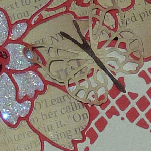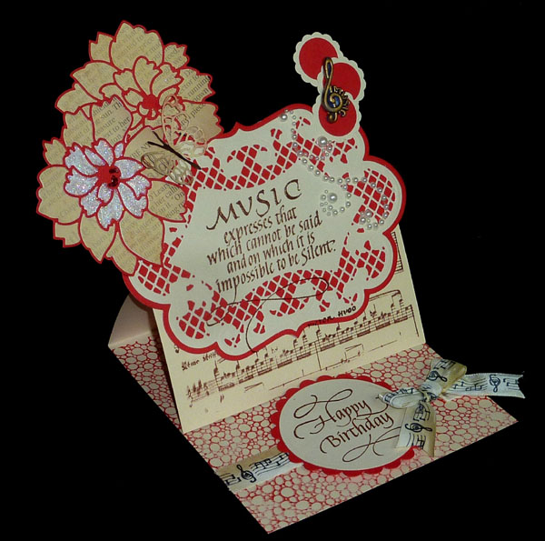 I created my easel shape from cream toned cardstock. Made a frame border mask using Tim's mask material and stamped the music sheet onto both front sections using Versafine Vintage Sepia. I die cut the lattice piece (Marianne Designs LR0236) from cream cardstock and the under piece from red cardstock. Adhered them to my card front. Die cut the flowers (Memory Box "Lovely Peony Outline") from both newspaper text scrapbook paper (creative Imaginations "Style Page") and red cardstock, reassembling the pieces onto a solid cut out of the flower - I used my electronic cutter to cut mine, but it's available as a die also. I used my Quickie Glue Pen to fill some of the center areas and sprinkled with pastel pink glitter (Creative Beginnings "Pastel Assortment") and a touch of Glitter Ritz micro fine glitter "Ruby Red". Adhered both my flowers to card front. Die cut the little butterfly (Memory Box "Pippi") from the text paper and colored the body section with a brown Zig Writer, adhered the elements and then onto the card. Punched some small red circles (3/4" circle punch) and some cream scallop circles (EK Success), adhered them together and in a group. Used a Krylon gold leafing pen to color my music charm, then adhered to card with Golden's heavy gel medium. Stamped the Music quote with Versafine "Vintage Sepia" and clear embossed. Wanted some pearls on the front and was pulling out my various packages and hit upon this flourish one that I thought was perfect... Stamped the floor of the easel with Impression Obsession CAC "Bubbles" using Distress "Festive Berry". Colored the white music ribbon with Distress Stains "Antique Linen" and a touch of "Picket Fence", dried and adhered to card base with Sookwang tape. Tied a peg bow and adhered that with the heavy gel medium. Stamped the Happy Birthday with the brown on cream cardstock, die cut with Spellbinders circle die and die cut the matching Spellbinders scallop circle from red. Adhered it over the music ribbon with 3D adhesive squares. |