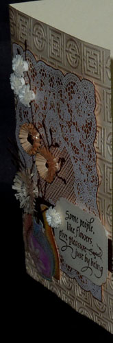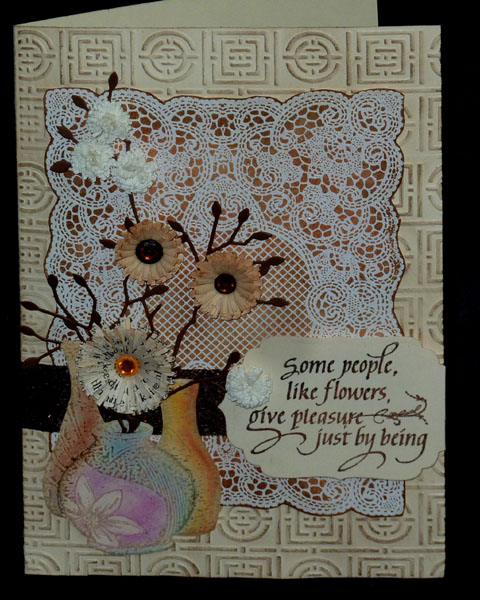 The main card is cream toned, side folded. I used a Craft Concepts embossing folder (Weaving Block set) for the background, shifting it to do the full card front. Then lightly touched the high points with a sponging tool and Distress Walnut Stain pad. Next layer is the lace piece (Just Rite "Lace Background"), stamped on cream cardstock with Versafine Toffee, then white embossed., Cut close to the stamping and sponged with Distress (Brushed Corduroy, Vintage Photo, lightly with Dried Marigold, and the edges with Walnut Stain). Adhered to card front. Adhered the glittery brown ribbon. The vase (Serendipity Stamps "Vase Set") is stamped on cream cardstock with Distress Pumice Stone and clear embossed, then colored with Pan Pastels using a Quilled Creations sponge tip applicator. Cut out and made a slit in the center vase to stuff my die cut branches through. Branches (Memory Box "Leafy Branch") die cut from dark brown cardstock. Die cut the fringes (Quilled Creations "Mum" die set) from Reader's Digest pages then rolled them around tight coils of either brown or bright yellow paper. Adding a small rhinestone in the centers. The white fringed flowers are die cut from Arches Text Wove paper - a really great paper for quilling. Stamped my quote - same as lace background and clear embossed. Die cut with Spellbinders Label Four, cut off the edge on the right side and adhered to card front with a double layer of 3D adhesive tape to make it really stand up. |