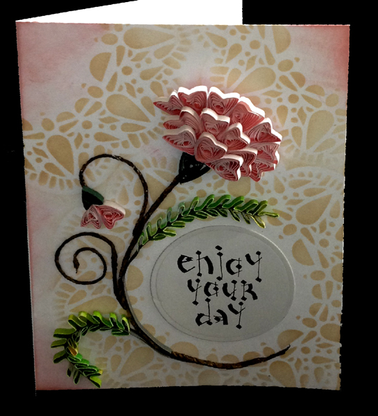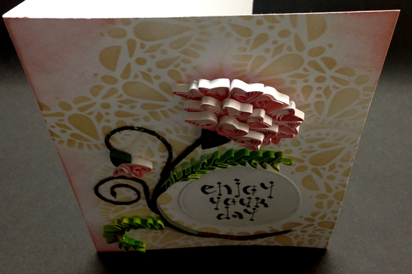 I sponged Distress "Antique Linen" though my doily stencil several times, then added some "Picked Raspberry" in the open spaces and edges. I wrote my words with a Parallel Pen and then die cut with Spellbinders circle die, adhered to card. Quilled my floral elements. And finally tried making paper cord. Wow was that easier than I thought... Painted the tissue paper with some acrylic paint first, then when twisted, ran it through some darker acrylic paint and left to dry. Adhered the 1st part to the 2nd part matching the right edge. Then adhered a couple flourish die cuts (Impression Obsession) from the cream cardstock. The leaves are done with my combing quill gadget I created.